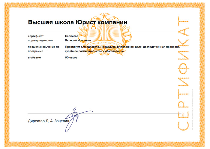 Внимание! Я, адвокат Саркисов В.И., не являюсь участником каких-либо рейтингов адвокатов. Обращаю внимание, что включение меня в рейтинги адвокатов («Лучшие адвокаты», «Лучшие уголовные адвокаты России» и пр.) и размещение на сайтах указанных рейтингов информации обо мне произведено неизвестными мне лицами без моего согласия. В настоящее время в Российской Федерации не существует каких-либо рейтингов адвокатов, формируемых органами адвокатского сообщества, информация в указанных рейтингах может быть недостоверной, в связи с чем я категорически не советую учитывать факт включения адвоката в тот или иной рейтинг, а также размещённую в подобных рейтингах информацию при принятии решения о заключении соглашения на защиту по уголовному делу как со мной, так и с любым иным адвокатом.